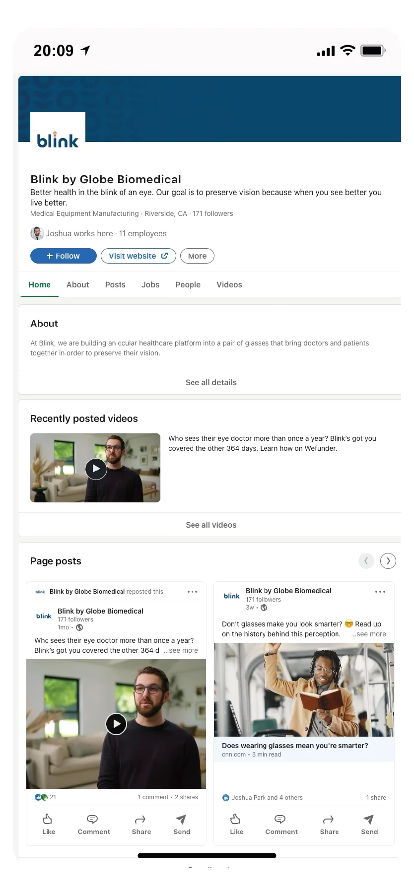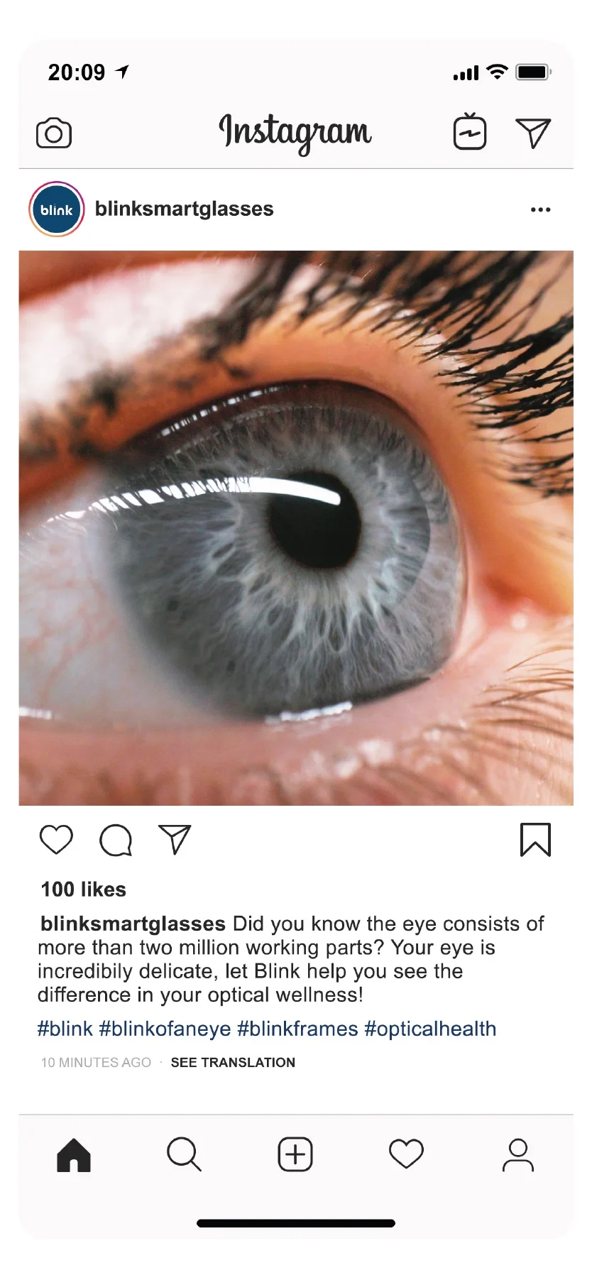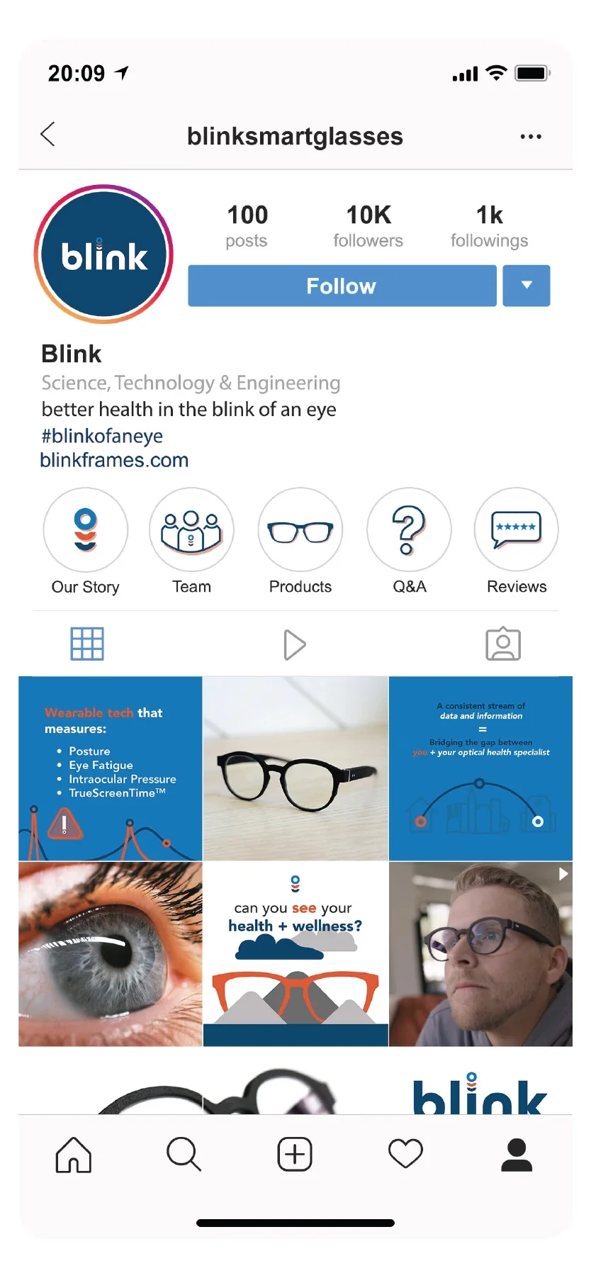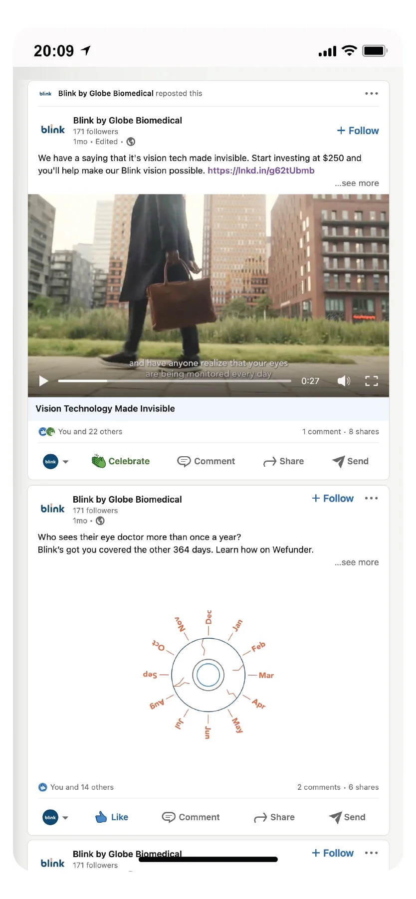 Like 👍🏻, Comment 💬, Share ↪️ or Follow ✅ Blink’s primary social platforms are Instagram, focusing on the general consumer, and LinkedIn, focusing on top Optometrists, Tech Enthusiasts, and Investors. As we build out Blink’s social we followed strategies for optimal posting themes and types of content to grow awareness through engagements and followers.